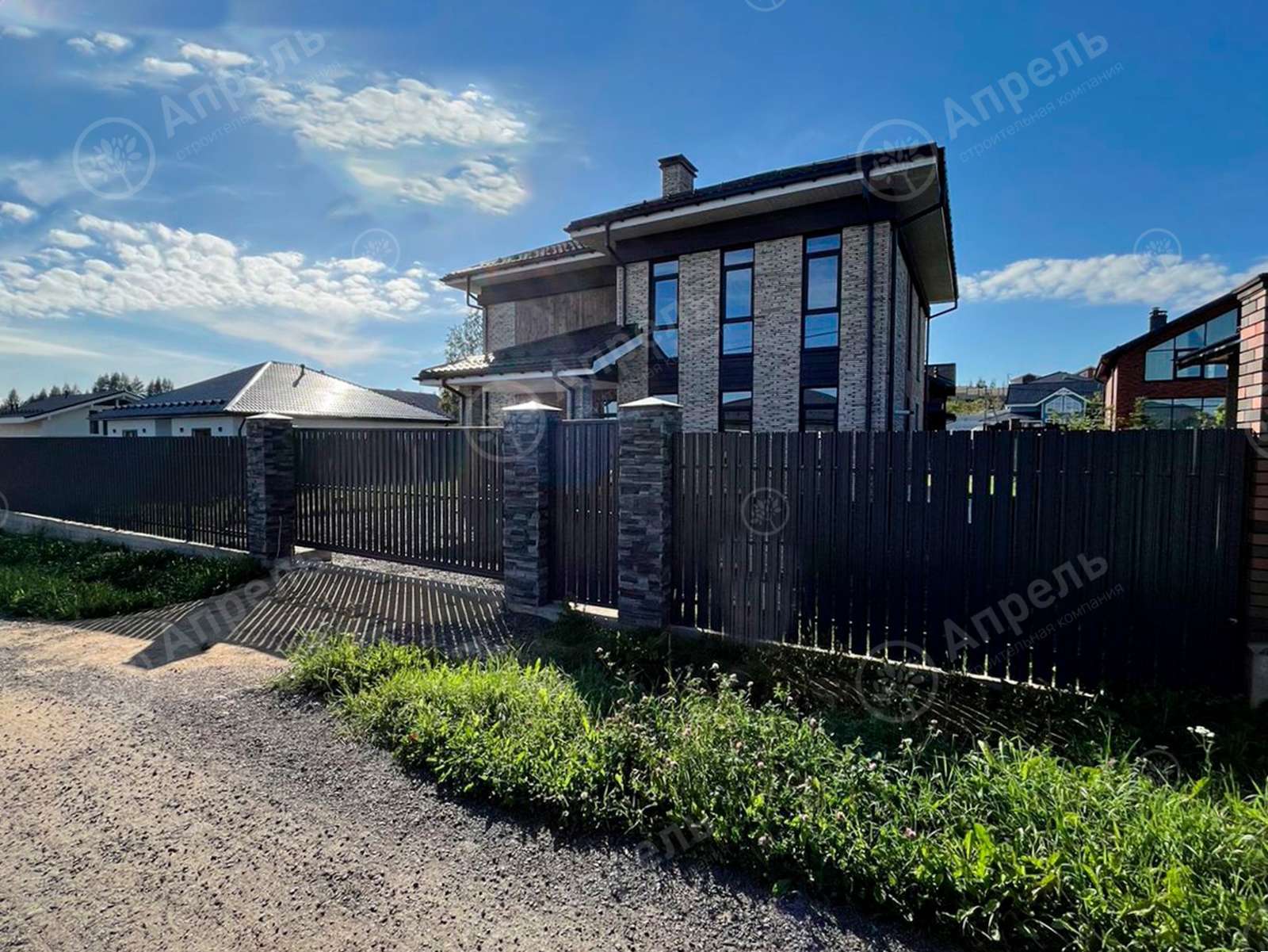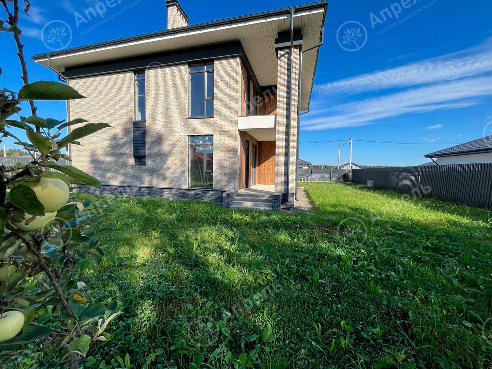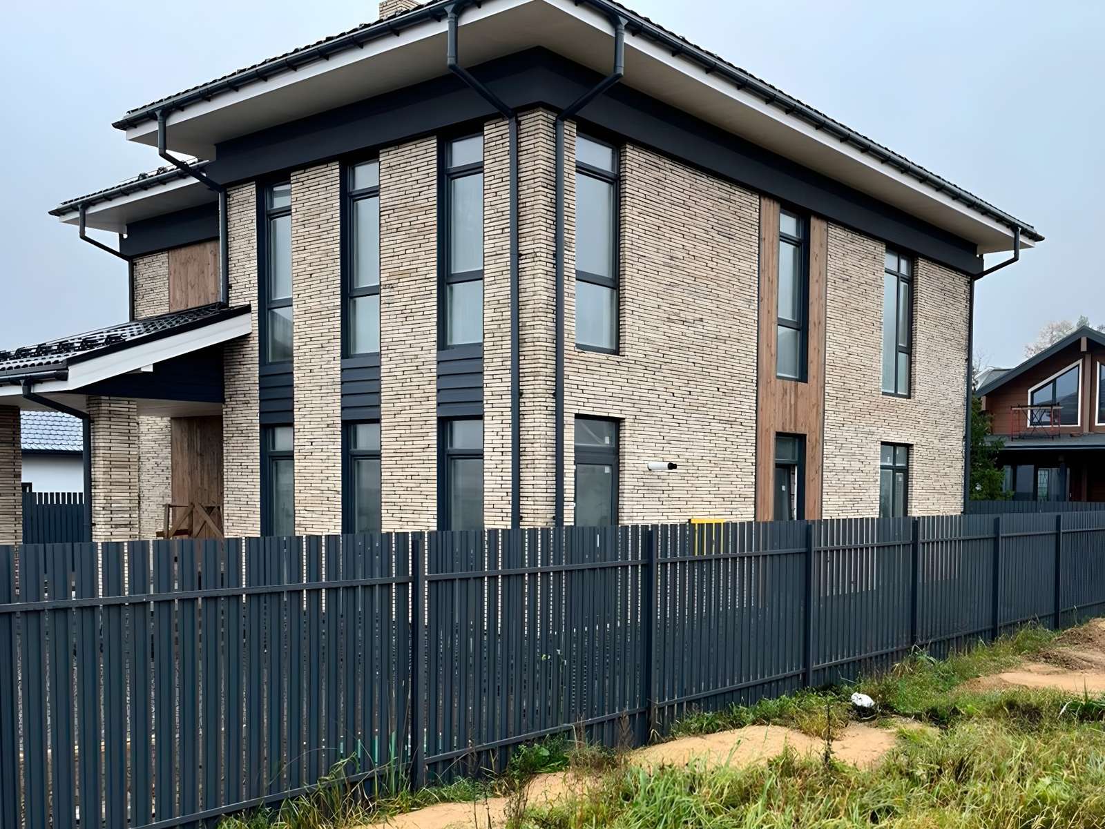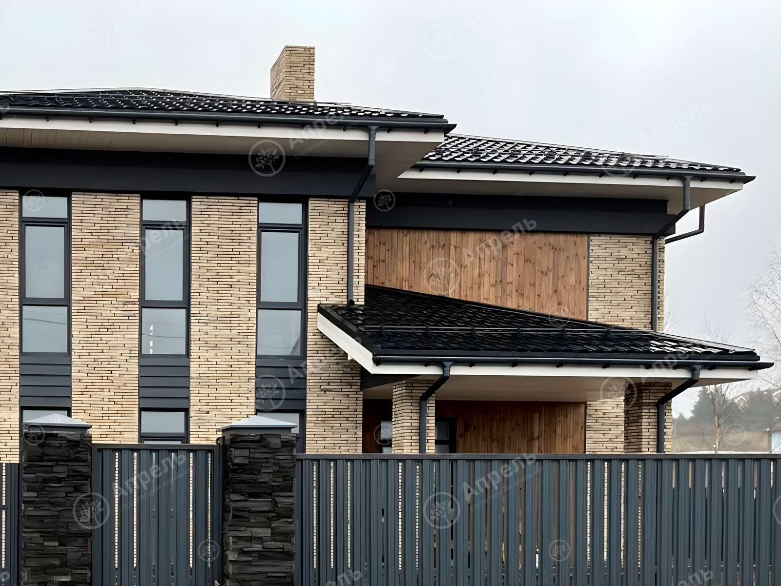 В этом доме 5 спальных комнат, кухня-гостиная и 3 санузла. Капитальные стены из газобетонного блока  толщиной 400 мм. Фасад дома выполнен из ригельного кирпича в комбинации с декоративными фасадными панелями и планкеном. Большое крытое крыльцо и терраса дома на общем фундаменте с домом + балкон.